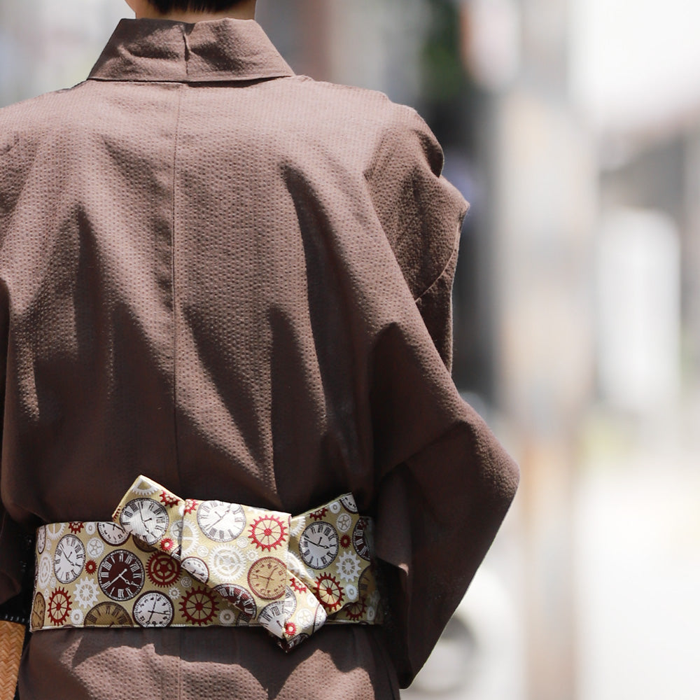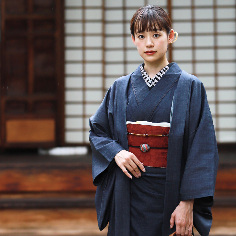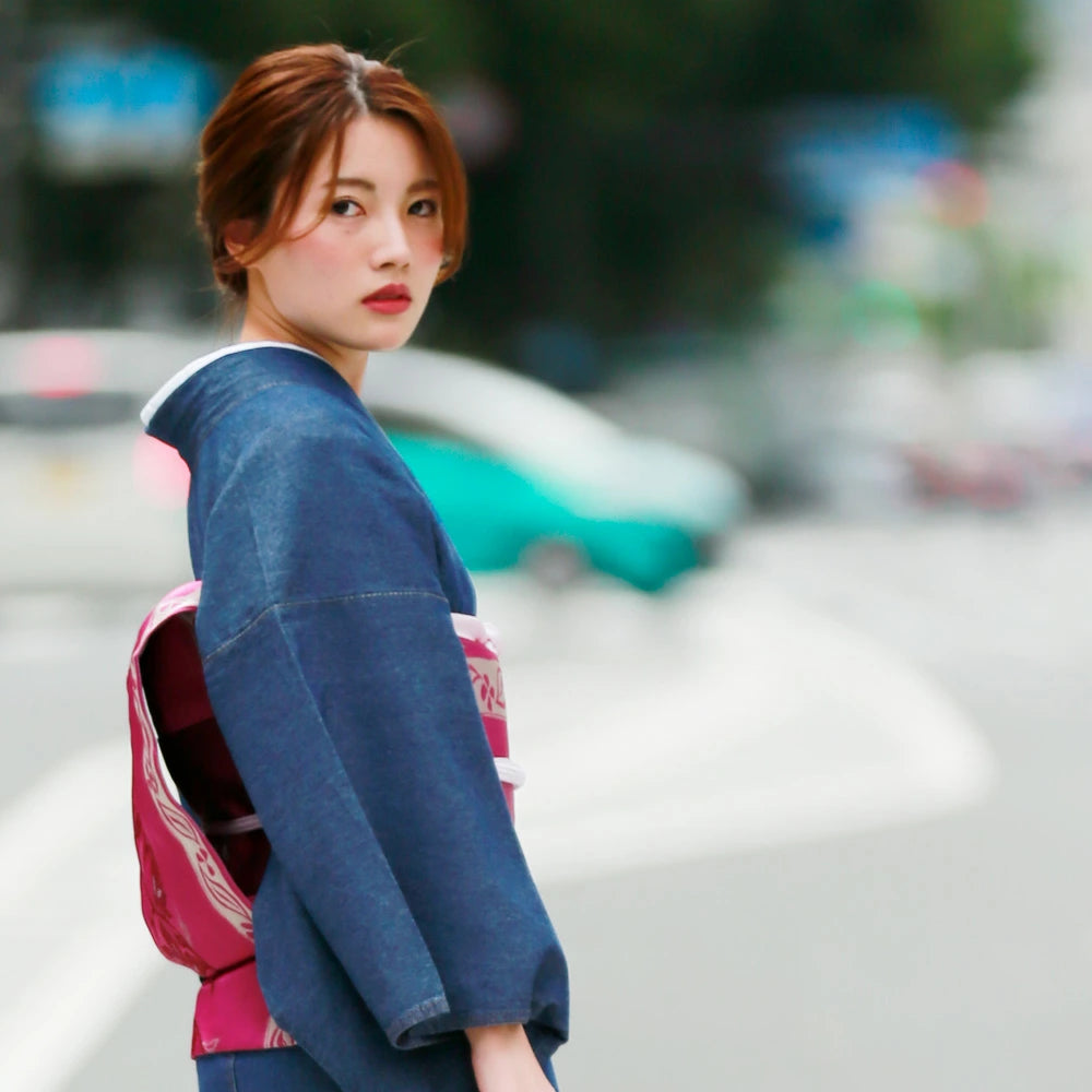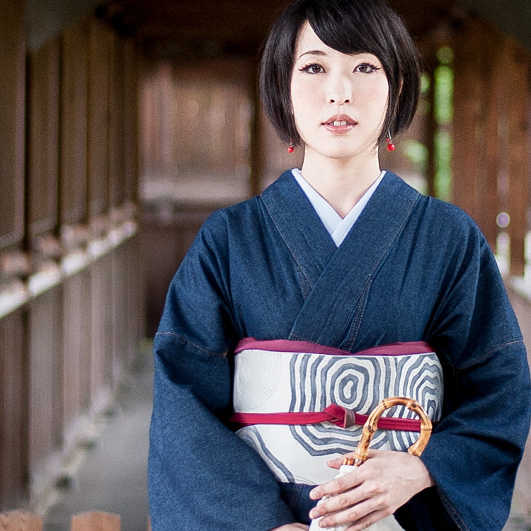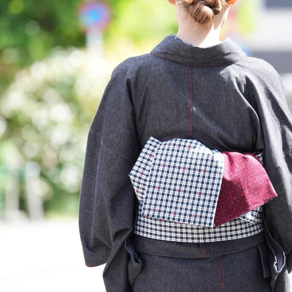 デニム着物はシンプルな無地なので、帯や半衿のコーディネートで様々な印象のコーディネートを楽しめます♪
