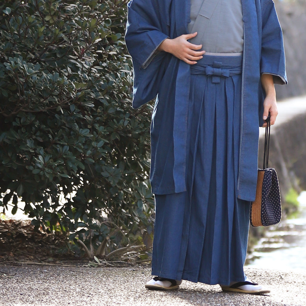 メンズもレディースと同様デニム着物とデニム作務衣を取り揃えているほか、馬乗り袴や、岡山デニムの半纏もご用意♪