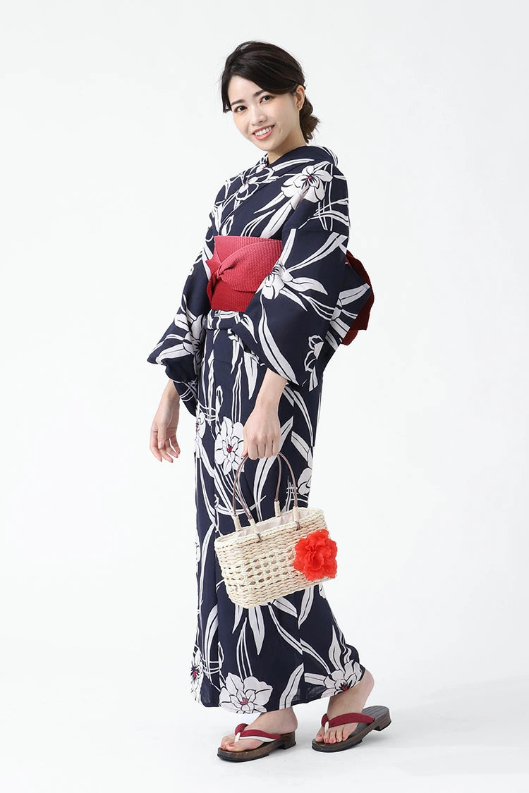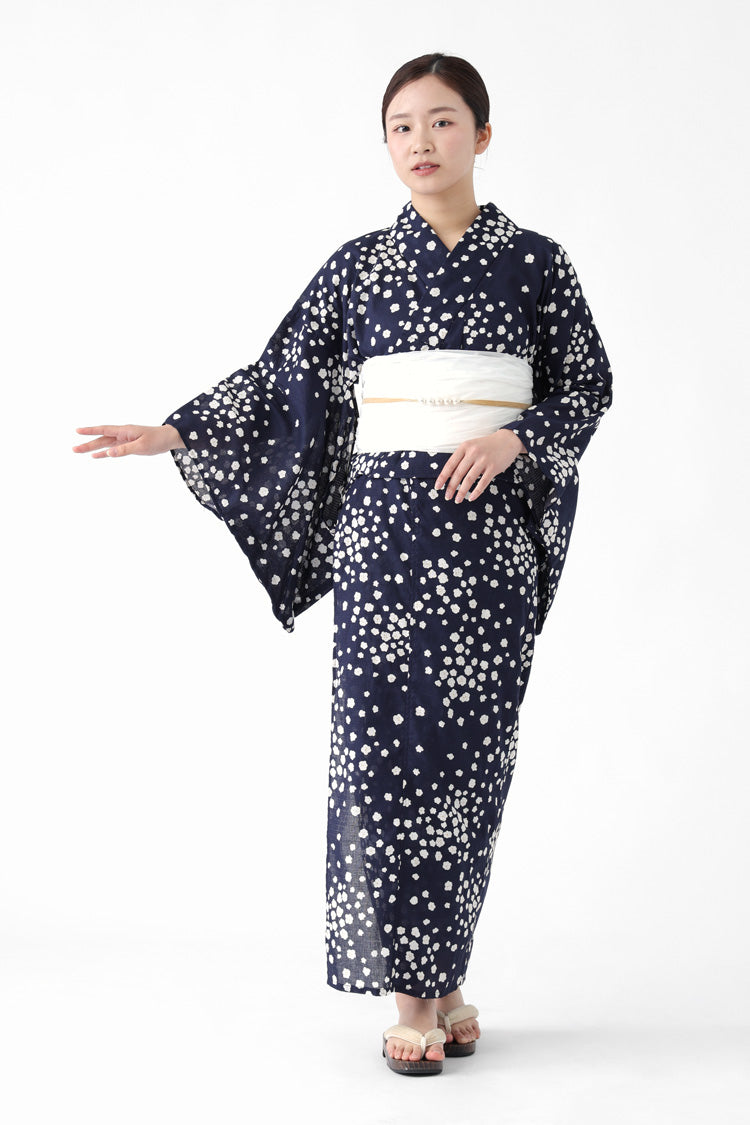 深く染まった濃紺に、白いヒメシャガの花が美しいこちらの浴衣。
