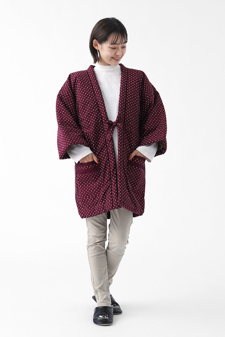 深みのあるワインレッドが印象的なこちらのはんてん。