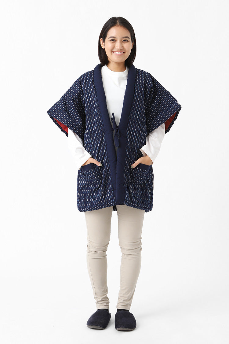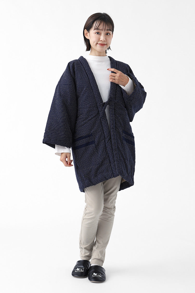 手ざわりと風合いの良さが特徴のはんてん。保温、保湿に優れた中綿は、太陽に干せば何度でもふっくらと膨らみます。お尻まですっぽり隠れる長さで腰回りもあたたかいため、寒さを感じにくく室内でも快適に過ごせます。