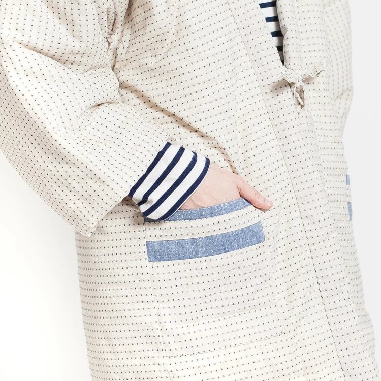 柔らかな印象の生成り色の生地と、紺色の糸で表現された絣のドッドの組合せが、とにかく可愛い。