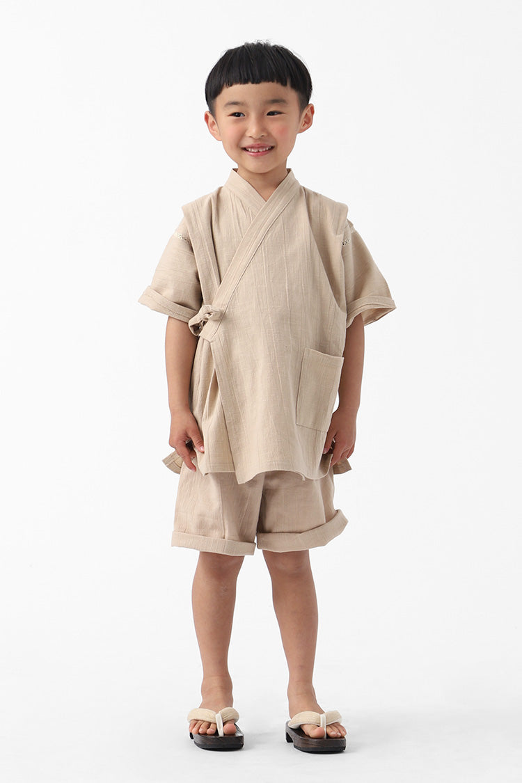 ▶キッズ甚平 ベージュ /モデル身長:112cm 着用サイズ:L(120)