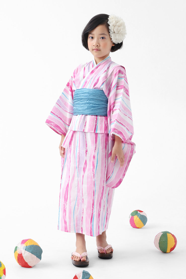 ▶キッズ浴衣 よろけ縞ピンク/モデル身長:122cm 着用サイズ:120cm