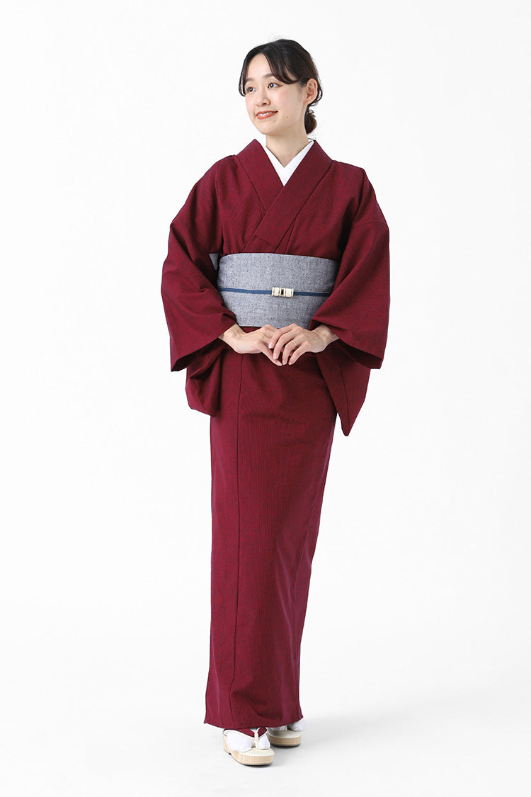 一見普通の赤い着物かと思いきや・・・ネップの風合いと細かい縞が上品な一枚です。