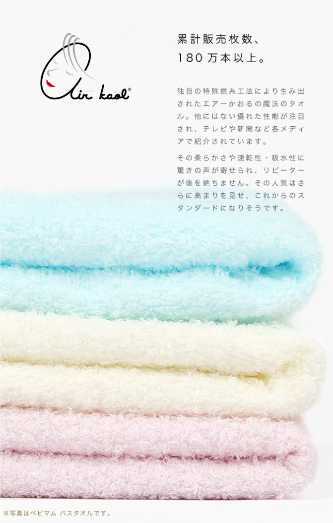 糸の間に空気の隙間を作る世界初の撚糸工法で作った、エアーかおるのタオル。軽くて柔らかいのにボリュームがあり、吸水性、速乾性にも優れています。また毛羽落ちが少なく、耐久性も抜群。経済産業大臣賞を受賞した特殊撚糸工法による本格的なタオルです。