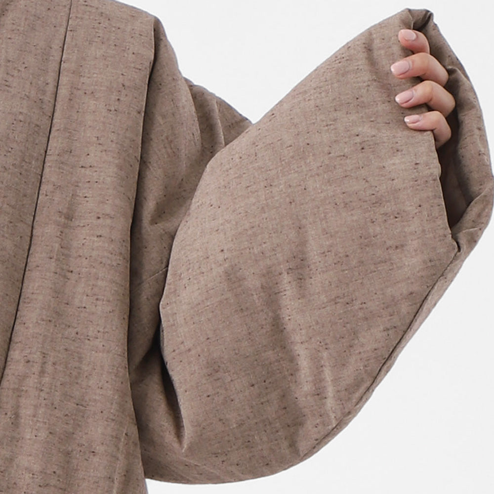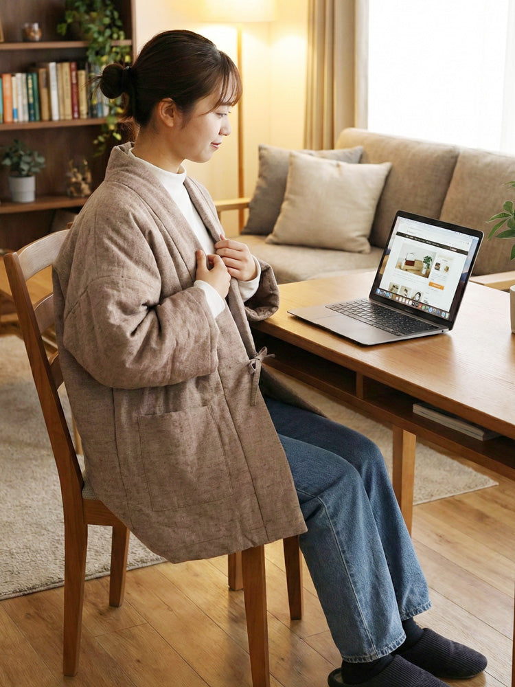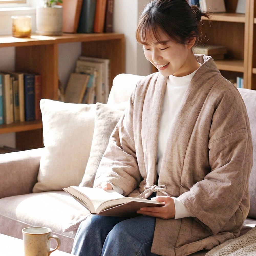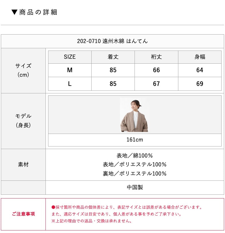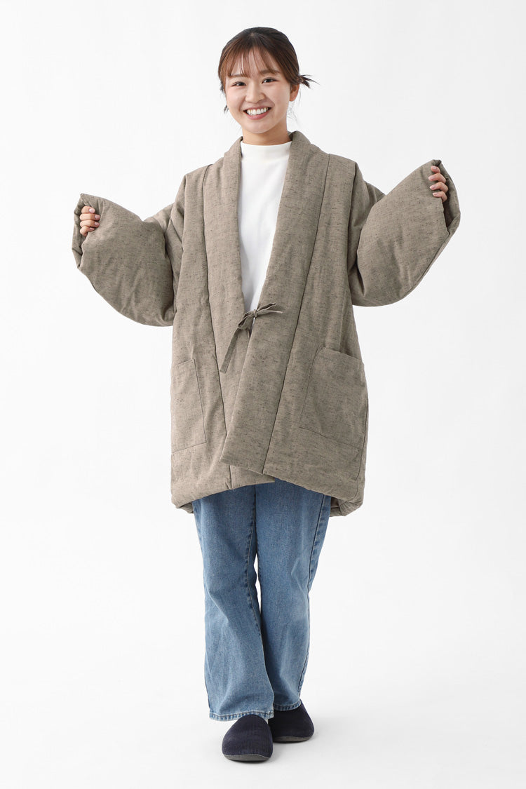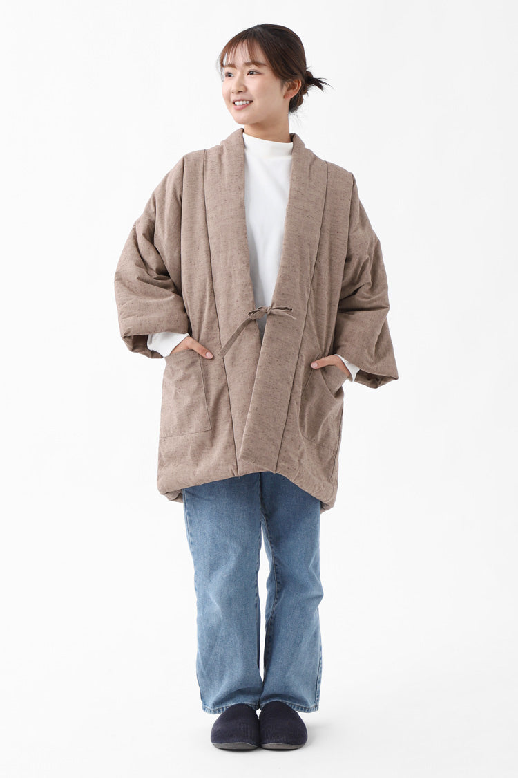 古来より受け継がれる遠州木綿(えんしゅうもめん)の柔らかな風合いをそのままに、現代のライフスタイルに溶け込むモダンなデザインに仕立てました。中綿入りで軽く、暖かく、家でのくつろぎの時間はもちろん、ちょっとした外出にも羽織れる、半纏です。