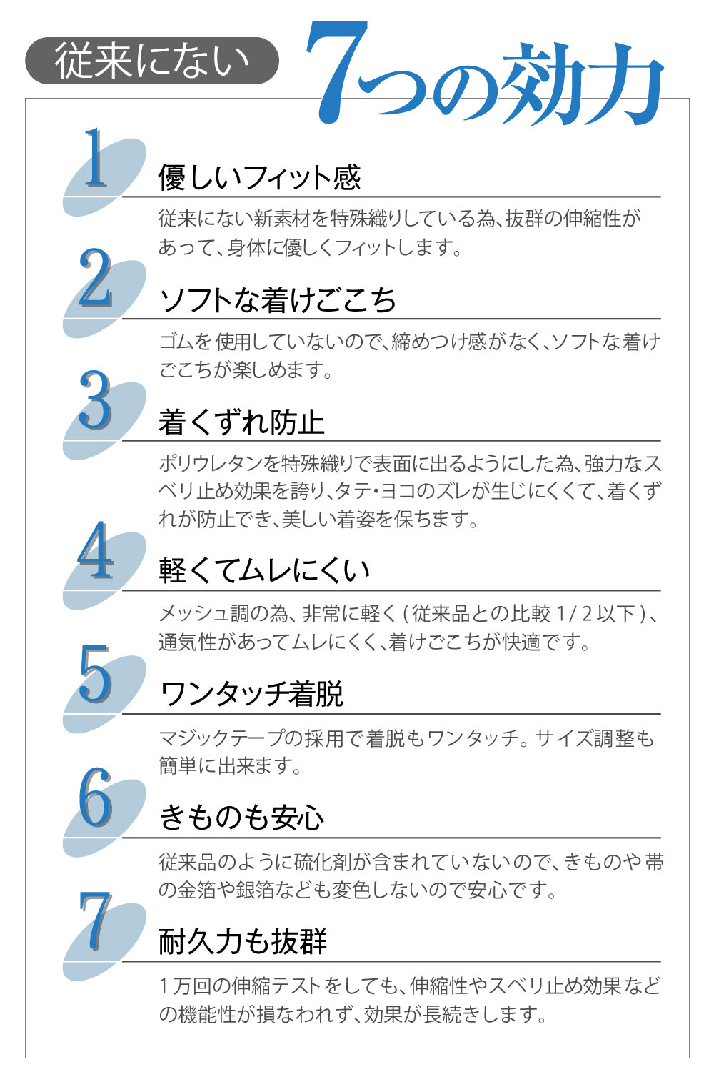 また、結びがないため、ごわつかず、スマートな着姿を永続的に提供してくれます。