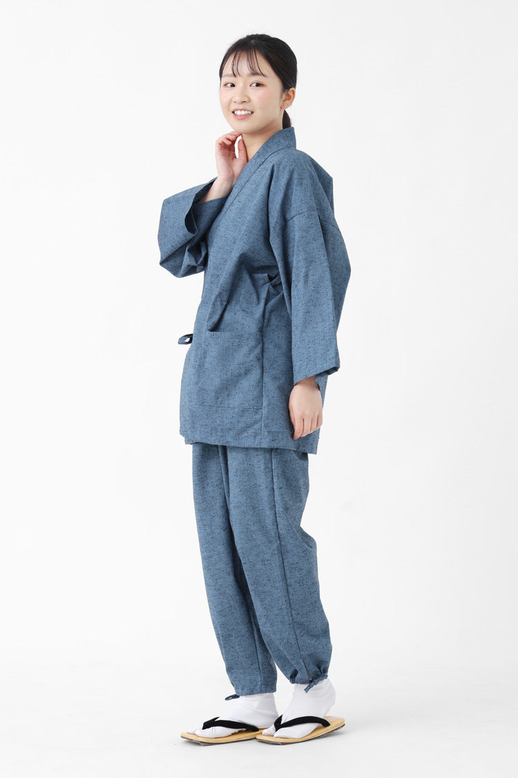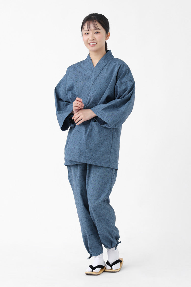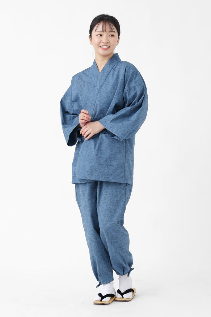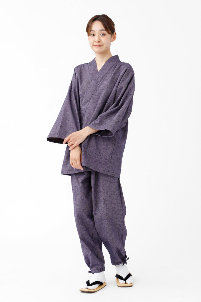 伝統の織生地を使用したレディース作務衣作務衣の歴史は古く、古来「日常の中にあるデザイン」として親しまれてきた経緯があります。 長年の洗練により、その機能性や使い勝手は、多種多様な衣服を選べる現代でも、独自の立ち位置を確立しています。もちろん女性も、使いやすさと着心地の良さを実感され、粋な衣類として着用される方が増えてます。昨今ではサステナブルを謳われる事もあり日本古来の伝統着がさらに着目されております。作務衣は、内紐と外紐による着用なので体型が変わったり、中に着るものを選ばず様々なシーンに着用できる点や、トレンドに左右される事なく永く着用できる点などから評価され、またちょっと粋なプレゼントとしても喜ばれる伝統着です。